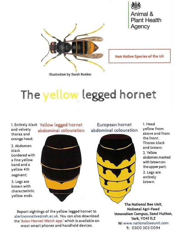Vespa velutina, known as the ‘Asian hornet’ or ‘yellow-legged hornet’ is an invasive species from Asia.  If you find one you MUST report it. The species arrived in France in 2004 and has spread rapidly.  As a highly effective predator of insects, including honey bees and other beneficial species, it can cause big losses to bee colonies, other native species and potentially ecosystems.  We have several beekeepers in Brentor who would appreciate your help in preventing this species from spreading.